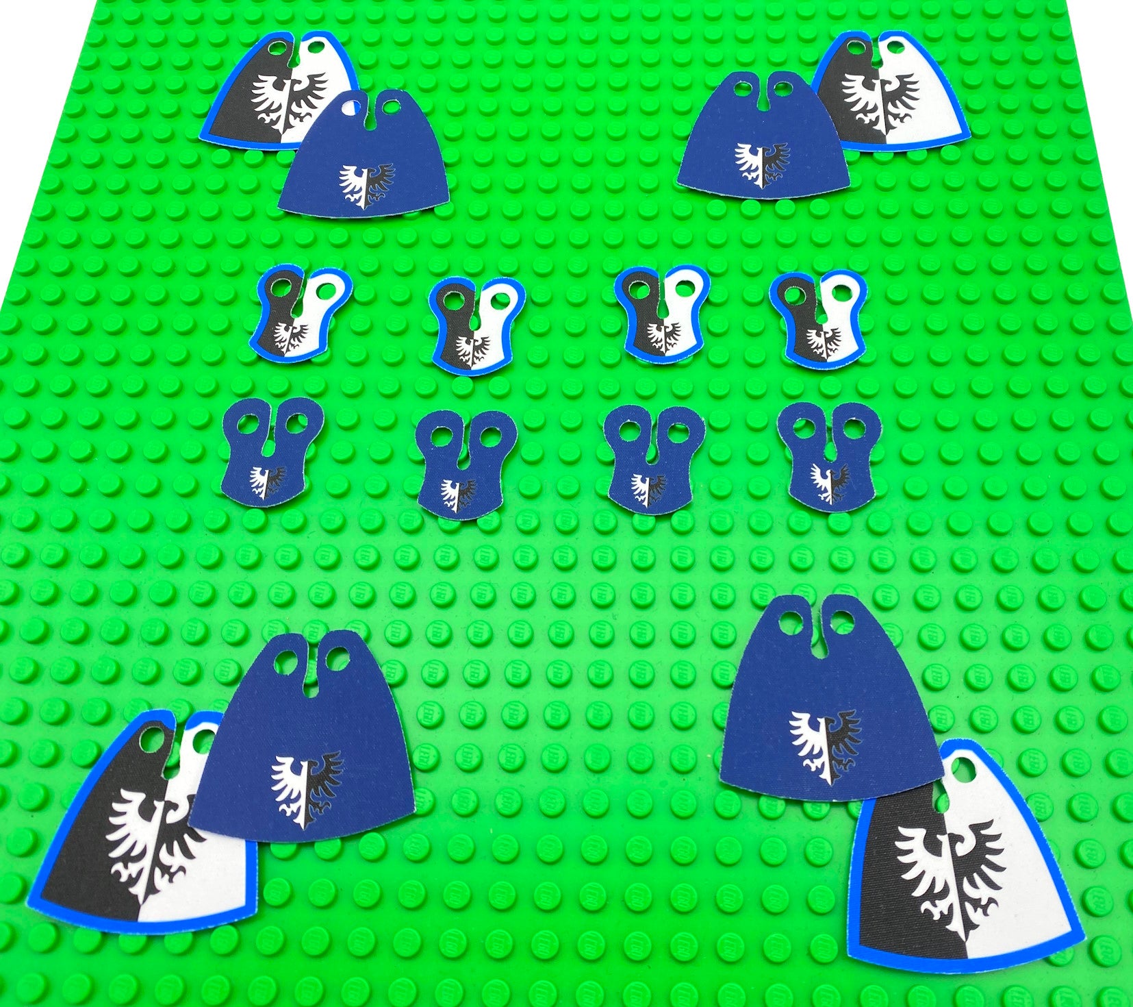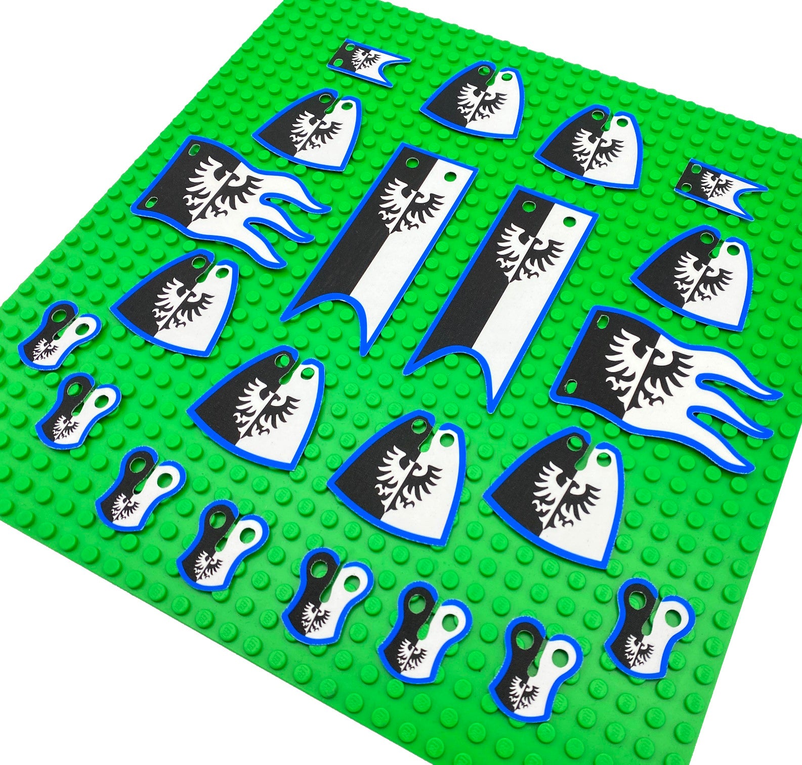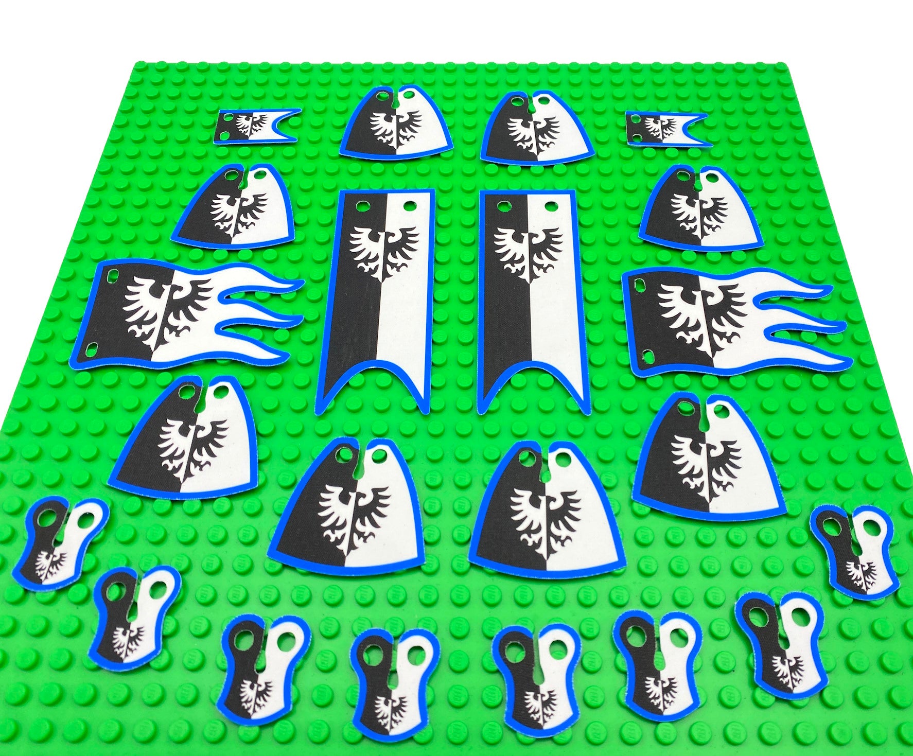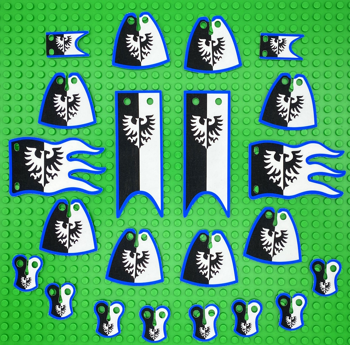 Unique product set for Classic Castle Black Falcons (Modern version). Custom pack of 8 cloaks, 8 pauldrons and 6 flags & banners. Create your own unique Black Falcons army with this amazing set. Double-sided print!