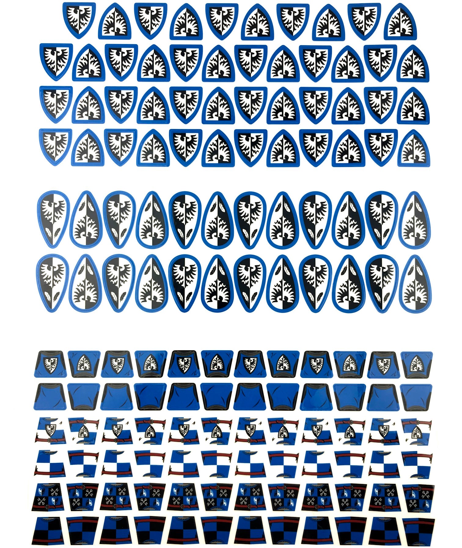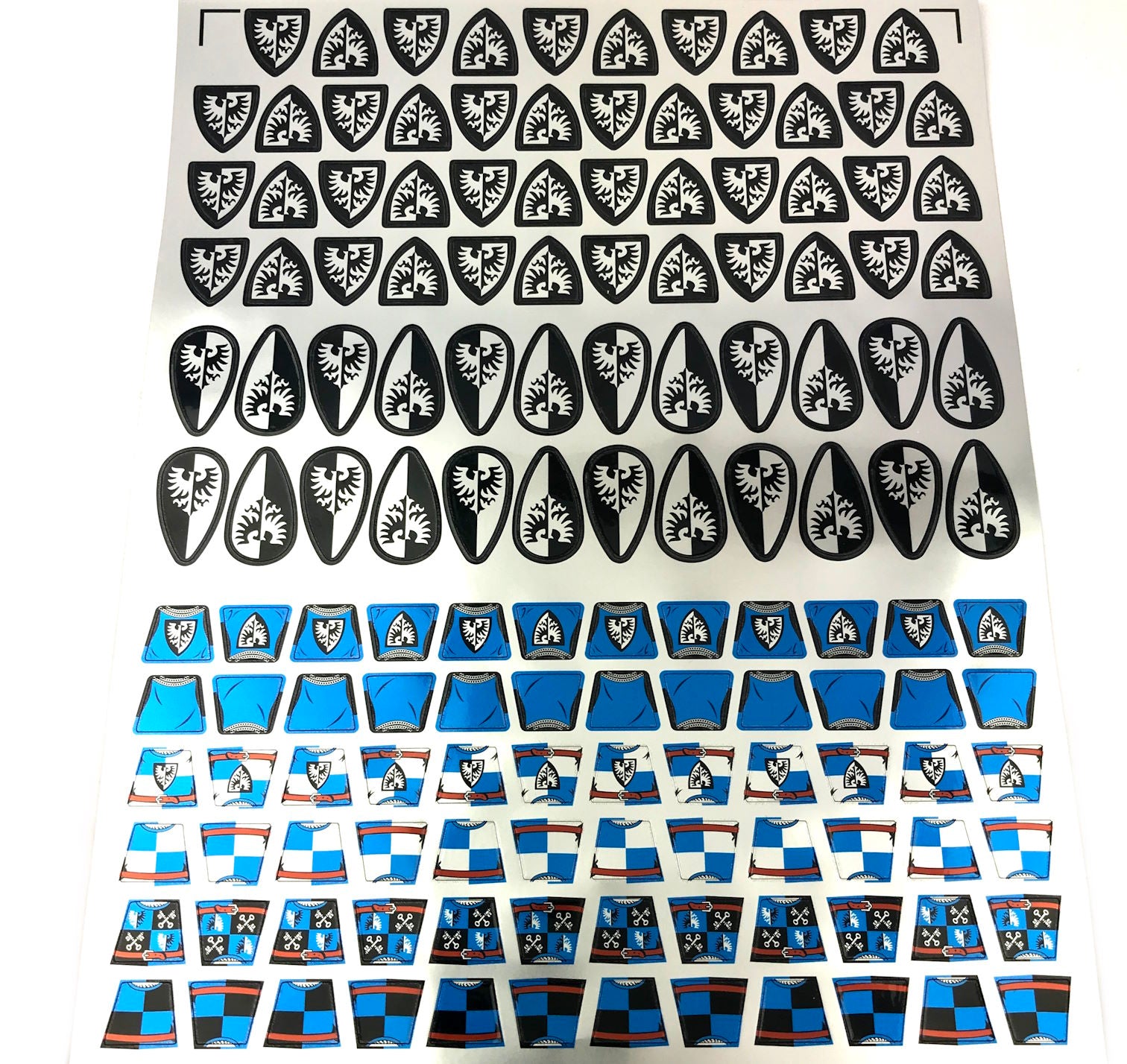 Over 140 stickers on one sheet! Wide range of designs including regular and ovoid shields and three different torso designs. Easily create a whole Black Falcon army from scratch! Two options available: metallic silver and white vinyl.