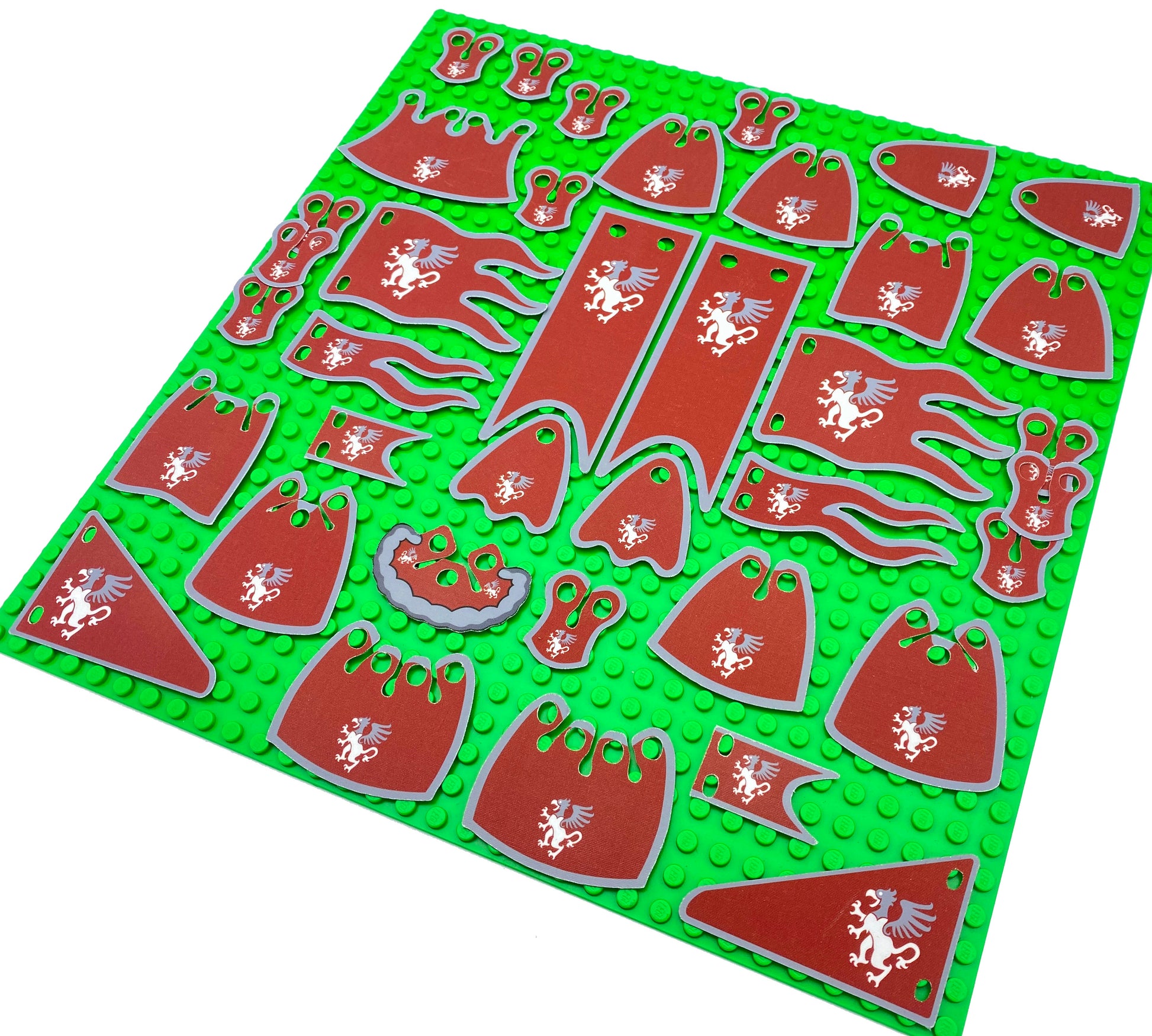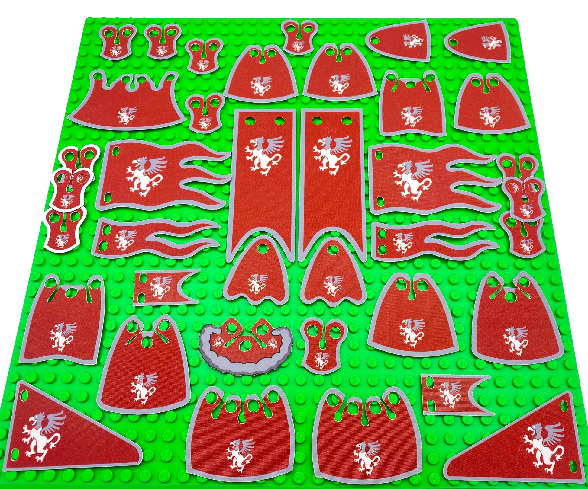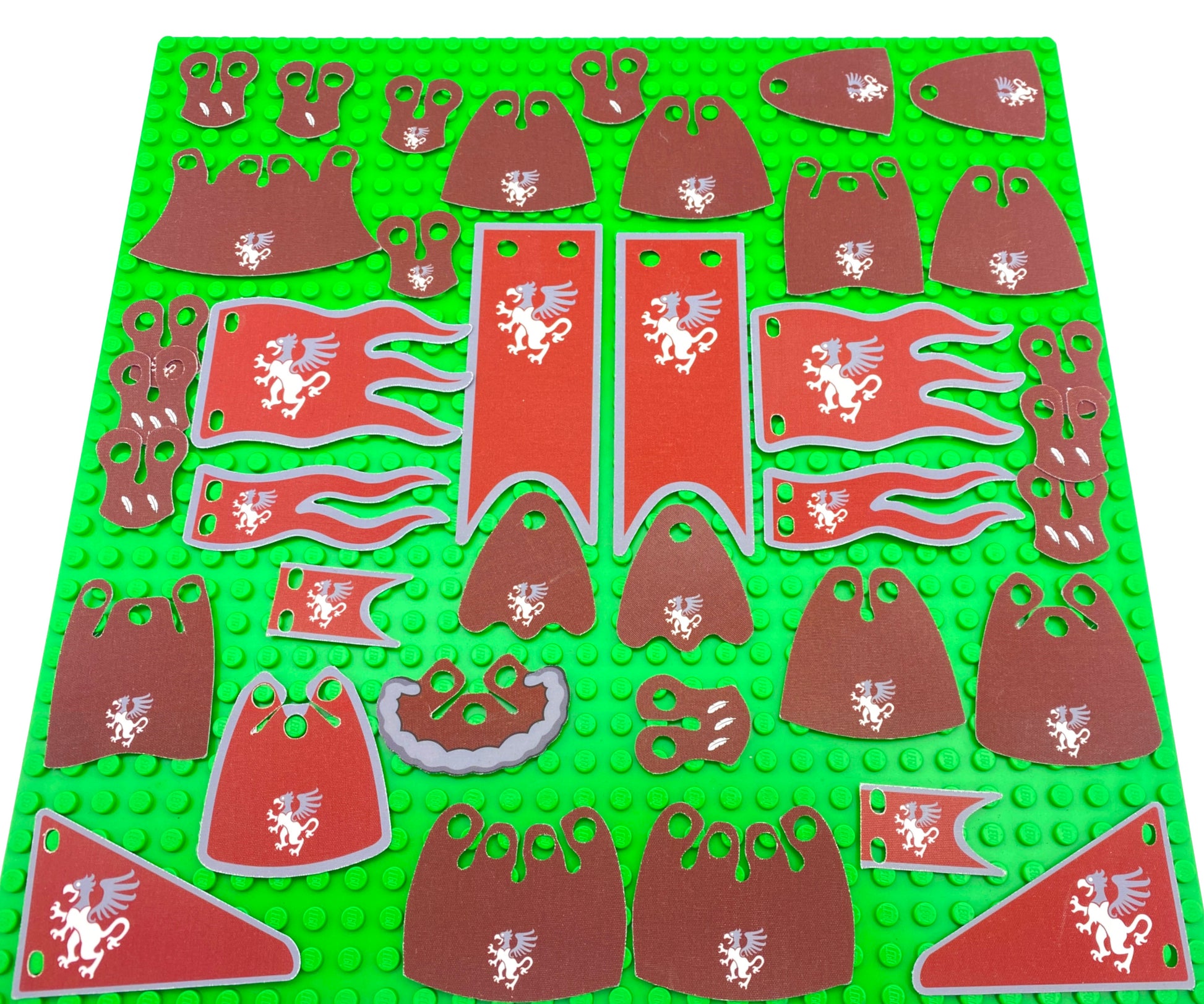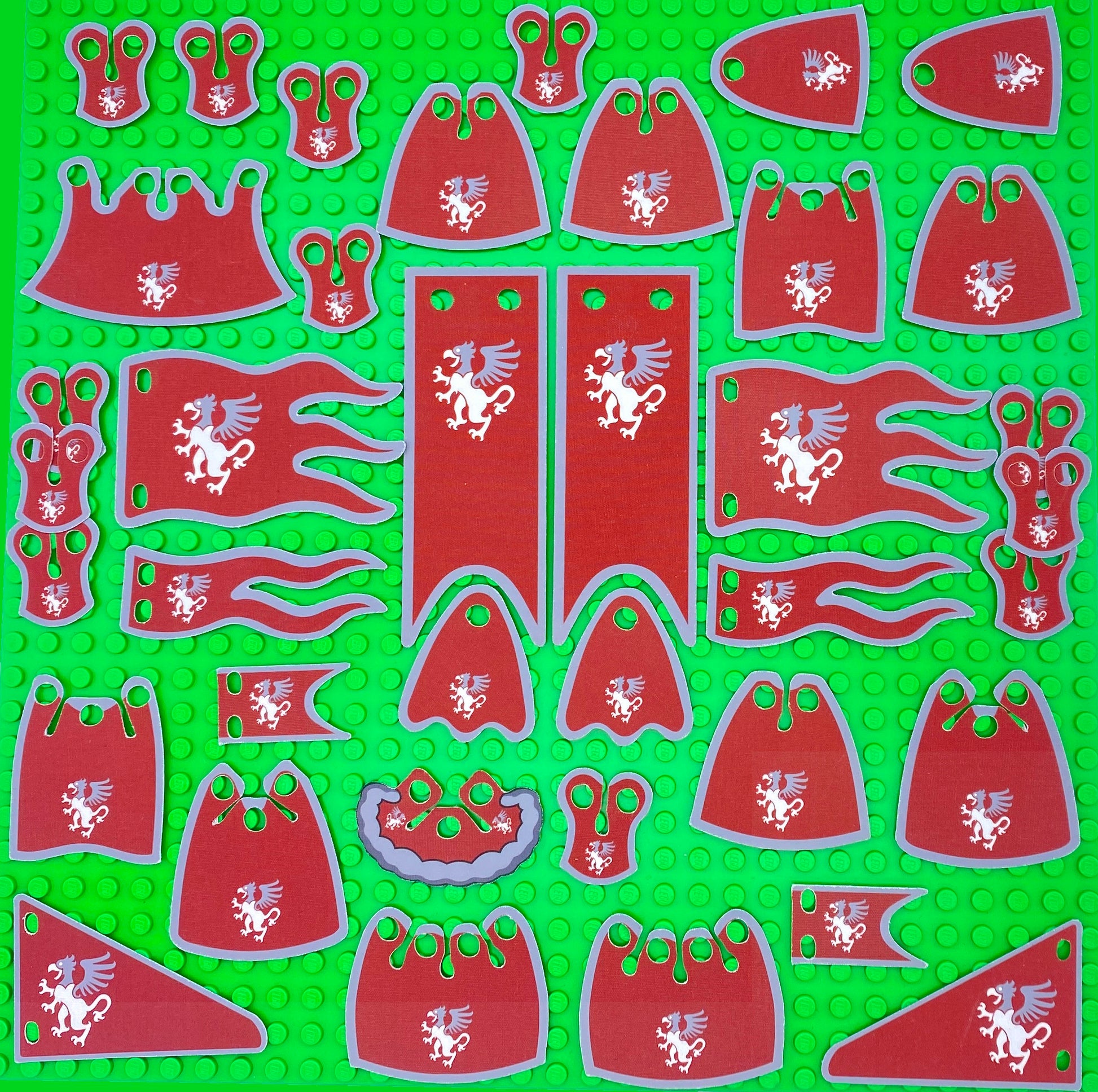 Extended set for the Griffin Knights capes, pauldrons and banners set. With this version you get a huge range of different items. The set includes capes, flags, banners and pauldrons, many with unique designs not available in the originals. Printing is double sided - capes & pauldrons have a different design on the back for extended use!