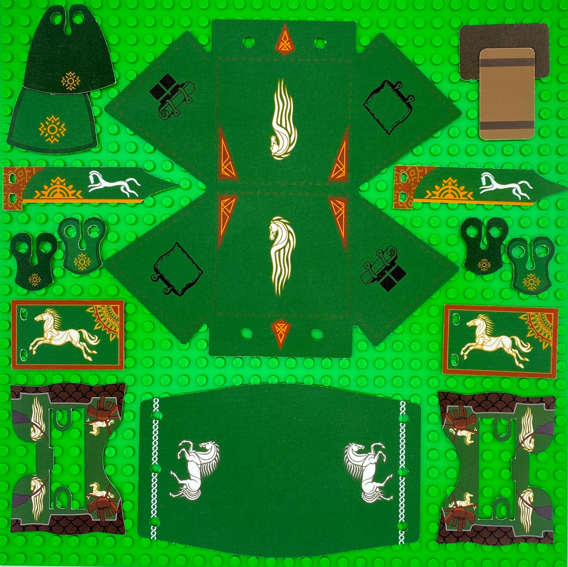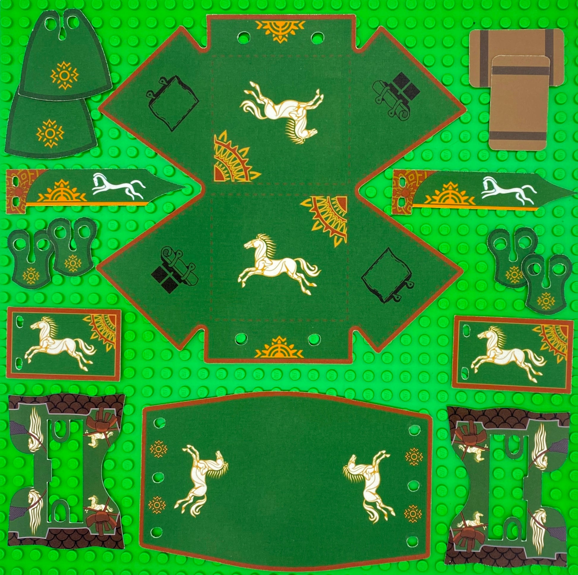 Total unique LOTR product! Create your own Rohan encampment with this great set which includes a tent, wagon cover, x4 flags, x2 capes & pauldrons and a pair of unique horse bardings. Tent and wagon tarp are double-printed with a different design on each side.
